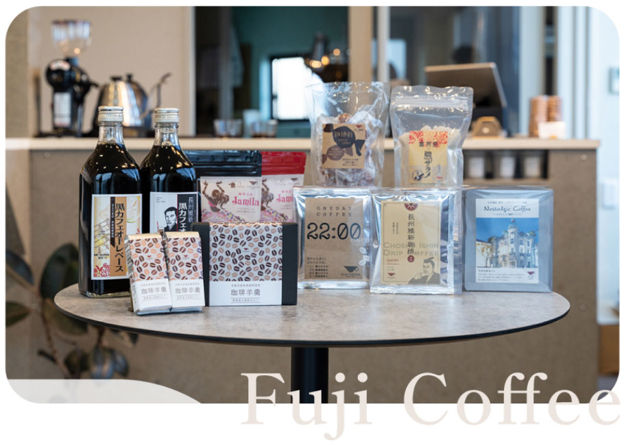 以来、先代から受け継いだ中煎りベースの軽やかな味わいを30年以上にわたり守り続けてきた上田氏。焙煎後の鮮度を大切にし、需要に合わせて少量ずつ焙煎することで常にベストな状態のコーヒー豆を提供する。さらに、持ち前のチャレンジ精神と豊かな発想力で「珈琲羊羹」や「珈琲飴」などさまざまな加工品開発にもいち早く着手。2013年には観光名所・唐戸市場のすぐそばにネルドリップのカフェをオープンするなど、時代の変化を見据えた先見の明で事業を拡大し、ふじ珈琲は現在、下関の役所や山口宇部空港と取り引きを行うほど地元で愛される存在となった。